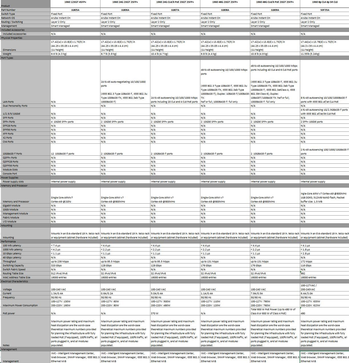| Notes1: 1 Acoustics measured in 23°C semi-anechoic chamber with a loading of 100% traffic and (for JL807A and JL809A) 50% PoE on all ports. Measured in accordance with ISO 7779. Declared in accordance with ECMA-109:2010. Values presented are the Declared A-Weighted Sound Power Level (LWAd) and the mean Bystander A-Weighted Sound Pressure Level (LpAm) | |