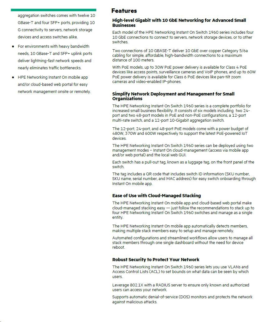 HPE Networking Instant On Switch 48p Gigabit 2p 10GBT 2p SFP+ 1960 (JL808A)1960 Provedení:Desktop, Rack mounted 19"; Funkce:QoS (Quality of service), VLAN (virtual local area network), DHCP snooping, Stohovatelnost, L2, Web management/Smart switch, VPN; Technologie:Gigabit Ethernet + 10 GbE porty; Počet portů LAN:48; Počet portů LAN:48; Přenosová rychlost LAN (Mb/s):131; Přenosová rychlost LAN (Mb/s):131; Počet SFP portů:4.