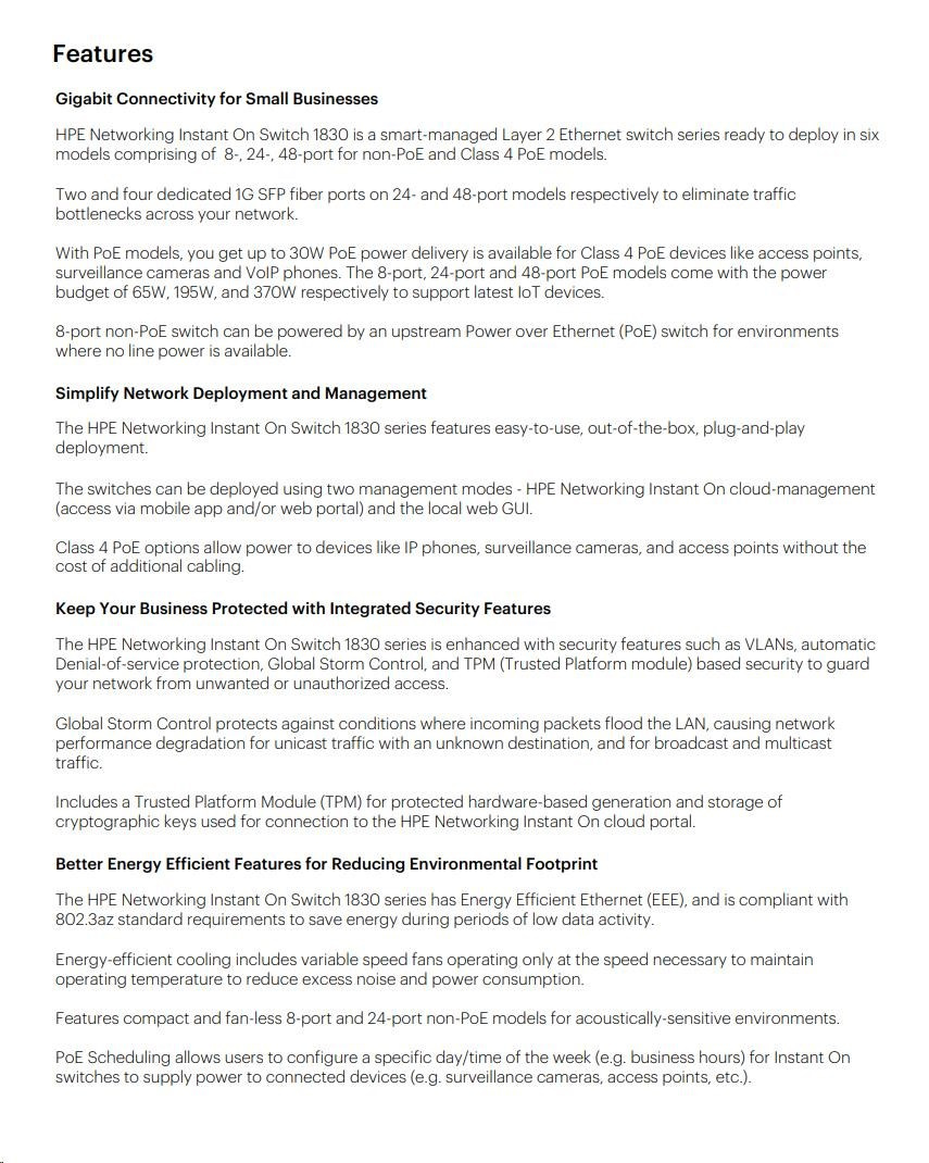 | Aruba Instant On 1830 8G Switch (JL810A) | Aruba Instant On 1830 8G 4p Class4 PoE 65W Switch (JL811A) | Aruba Instant On 1830 24G 2SFP Switch (JL812A) | Aruba Instant On 1830 24G 12p Class4 PoE 2SFP 195W Switch (JL813A) | Aruba Instant On 1830 48G 4SFP Switch (JL814A) | Aruba Instant On 1830 48G 24p Class4 PoE 4SFP 370W Switch (JL815A) | ||||
