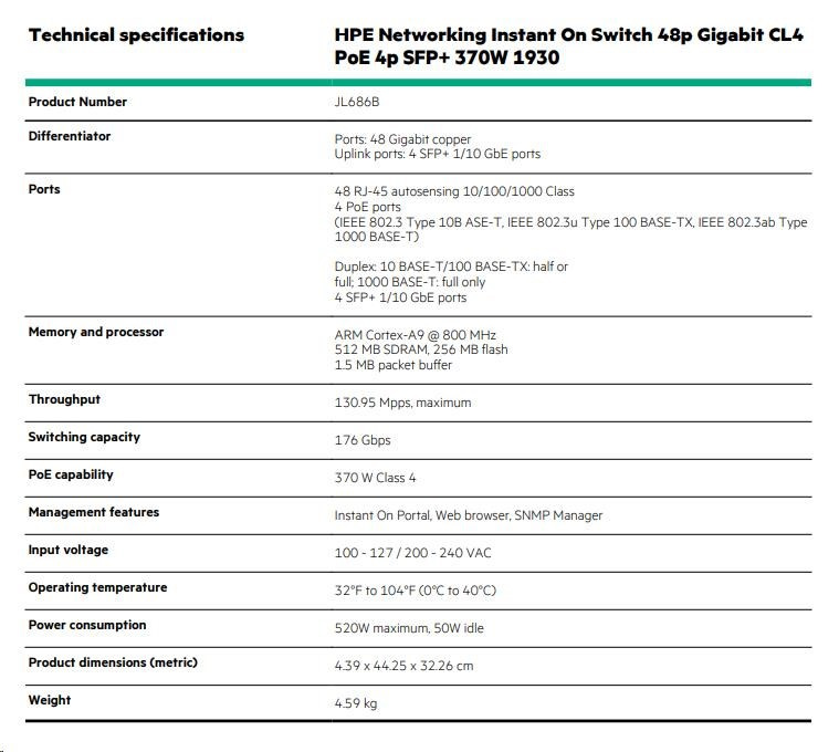HPE Networking Instant On Switch 48p Gigabit CL4 PoE 4p SFP+ 370W 1930 (JL686B)