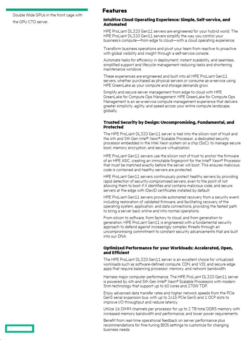 HPE PL DL320g11 6526Y (2.8/16C) 4x32G (p64706) 8SFF NS204(2x480Gm.2) VROC 2x1000W 2p10GT 7F Smart ChoiceProvedení serveru:Rack, 1U Rack; Výrobce CPU:Intel; Maximální počet procesorů:1; Řada procesorů:Intel 16 Core Xeon; Model procesoru:Intel Xeon 6526Y; Velikost paměti RAM (GB):128; Maximální paměťová kapacita serveru (GB):512; Maximální počet slotů PCIe:2; Maximální počet HDD v serveru:8; Hot-plug cage pro HDD:2.5" SFF; RAID:1, 5; Redundantní zdroj.