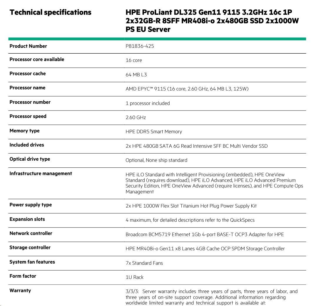 Diskuze k produktu HPE PL DL325g11 AMD Epyc 9115 (2.6/16C) 2x32G (P64985) 2x480G 2x1000W MR408i-o/4G 8SFF 4p1Gocp Smart Choice