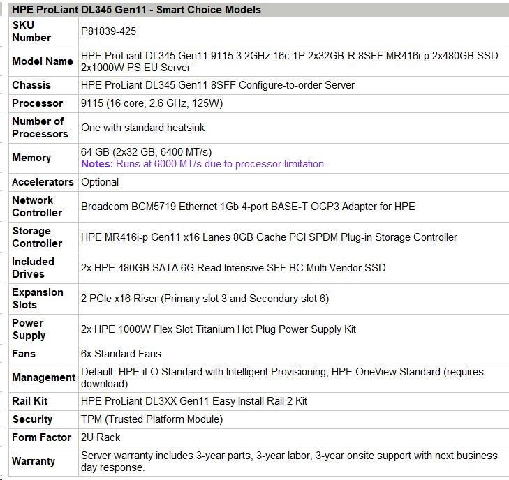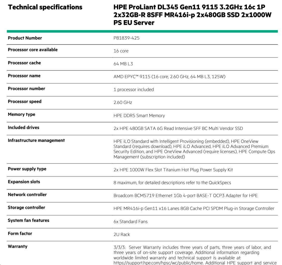 Diskuze k produktu HPE PL DL345g11 AMD Epyc 9115 (2.6G/16C) 2x32G 2x480G (P40497) 2x1000W MR416i-p 8SFF 4p1G Smart Choice