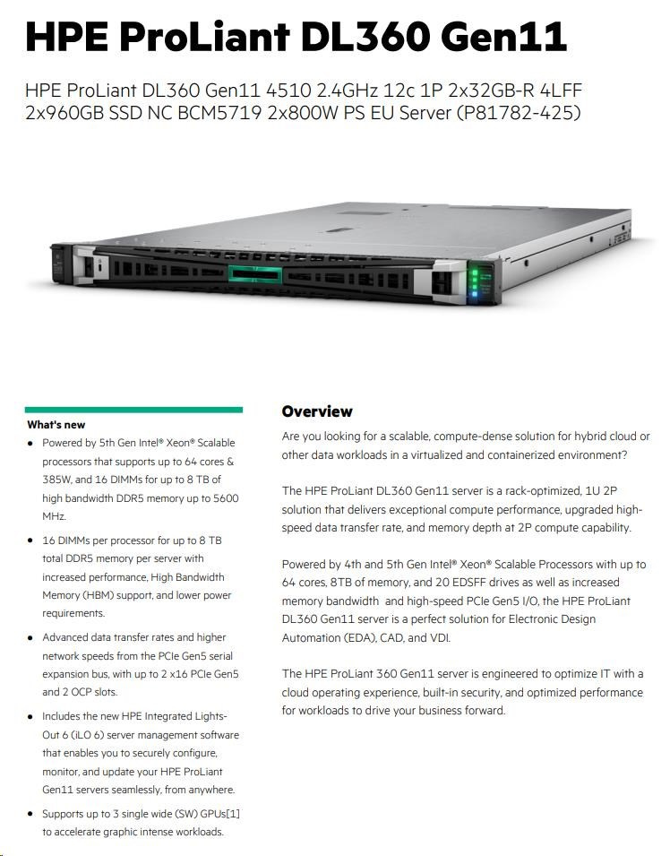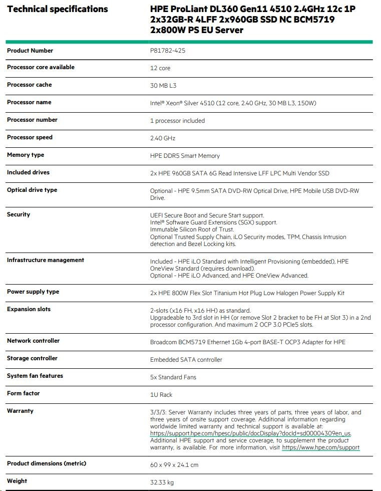 Diskuze k produktu HPE PL DL360g11 4510 (2.4G/12C) 2x32G 2x960G VROC 4LFF LPC 2x800W 4x1G Smart Choice