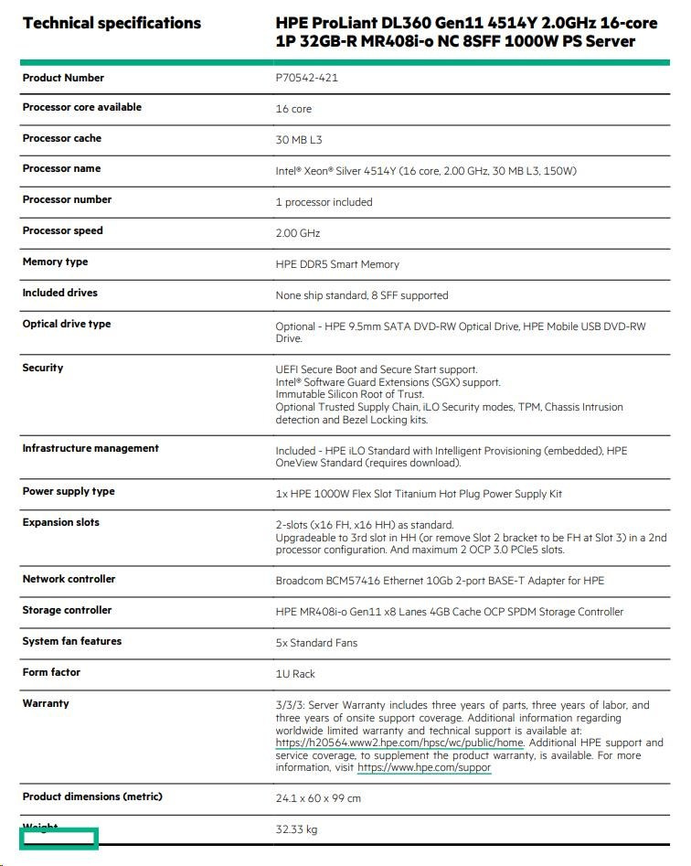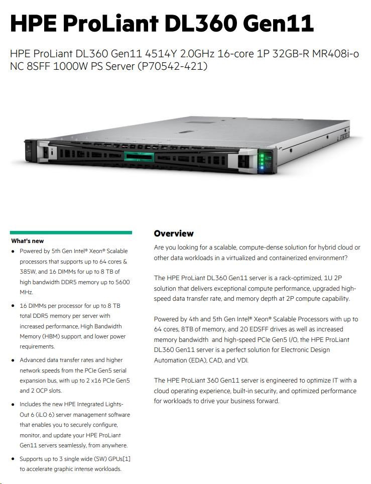 Diskuze k produktu HPE PL DL360g11 4514Y (2.0/16C) 1x32G (p64706) MR408i-o/4G 8-10SFF 1000W 2x10G-T 1U RENEW P70542-421