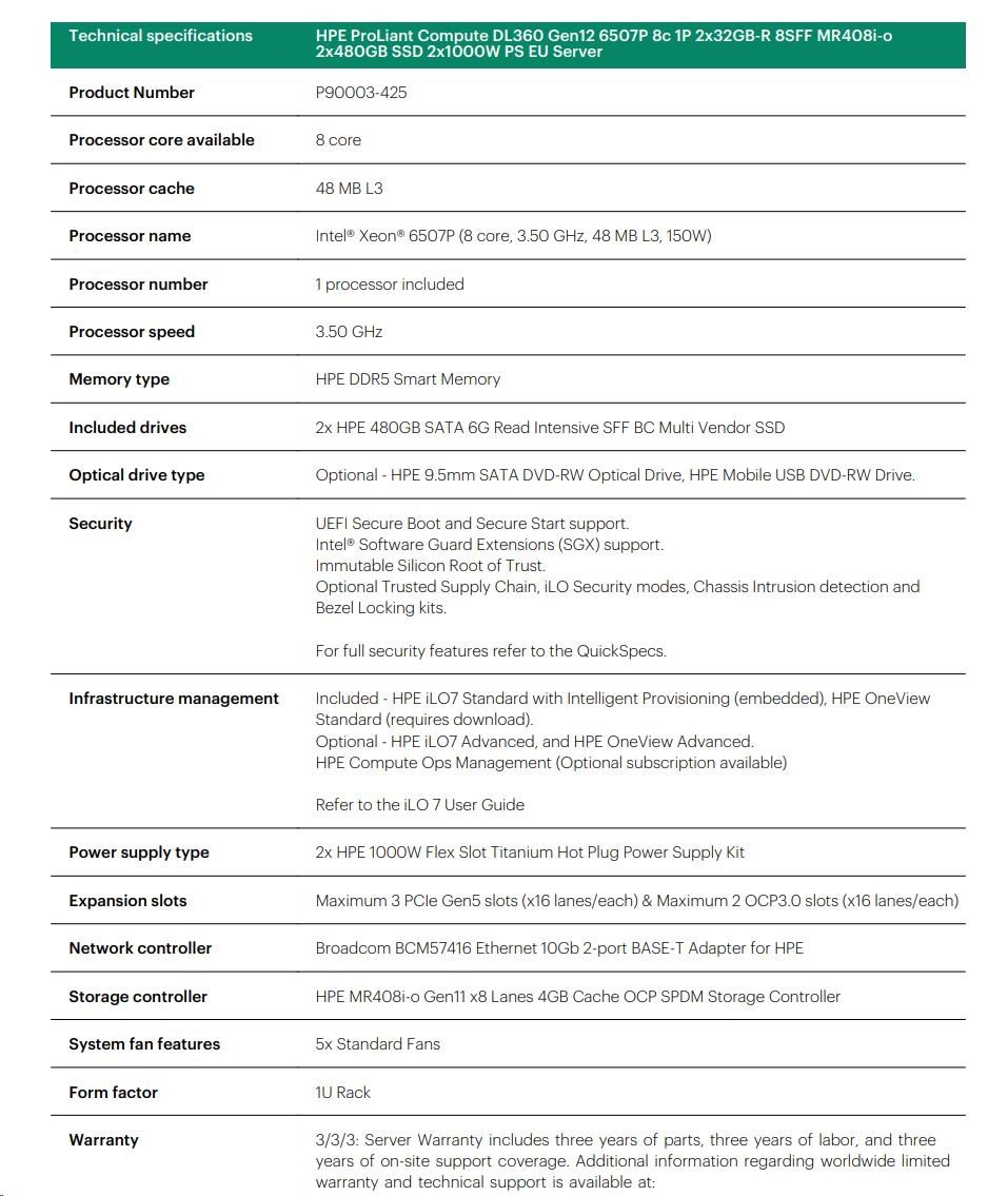 Diskuze k produktu HPE PL DL360g12 6507P (3.5/8C) 2x32G (P69727) 2x480G MR408i-o 8SFF 2x1000W 2p10G-T NBD333 Smart Choice