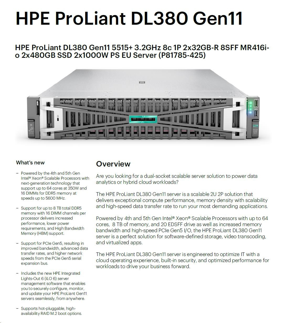 HPE PL DL380g11 5515+ (3.2/8C) 2x32G (p64706) MR416i-o/4G 2x480G 2x1000W 2x10G-T Smart Choice