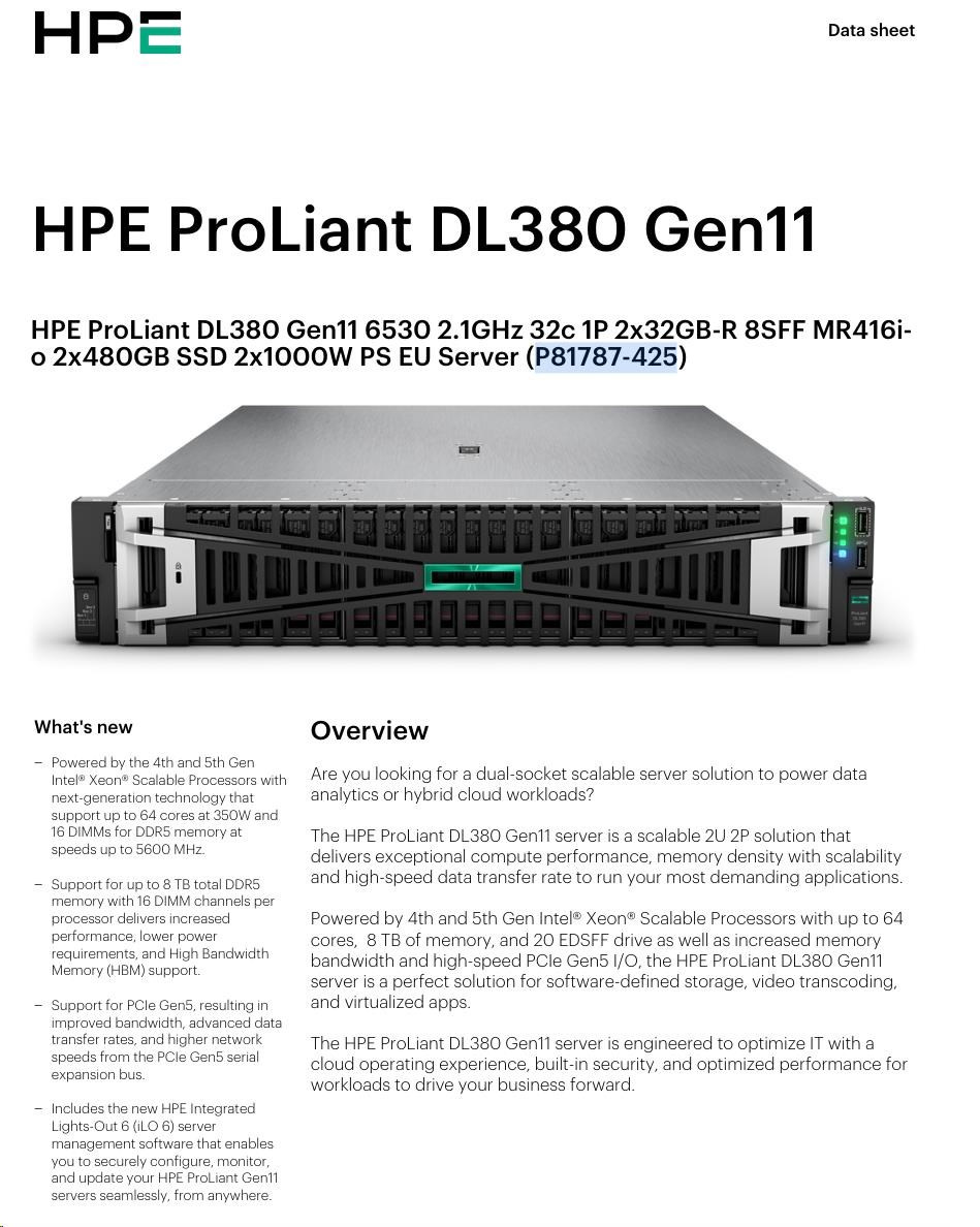 Diskuze k produktu HPE PL DL380g11 6530 (2.1G/32C) 2x32G (p64706) MR416i-o/4G 2x480G 2x1000W 2x10/25G-o Smart Choice