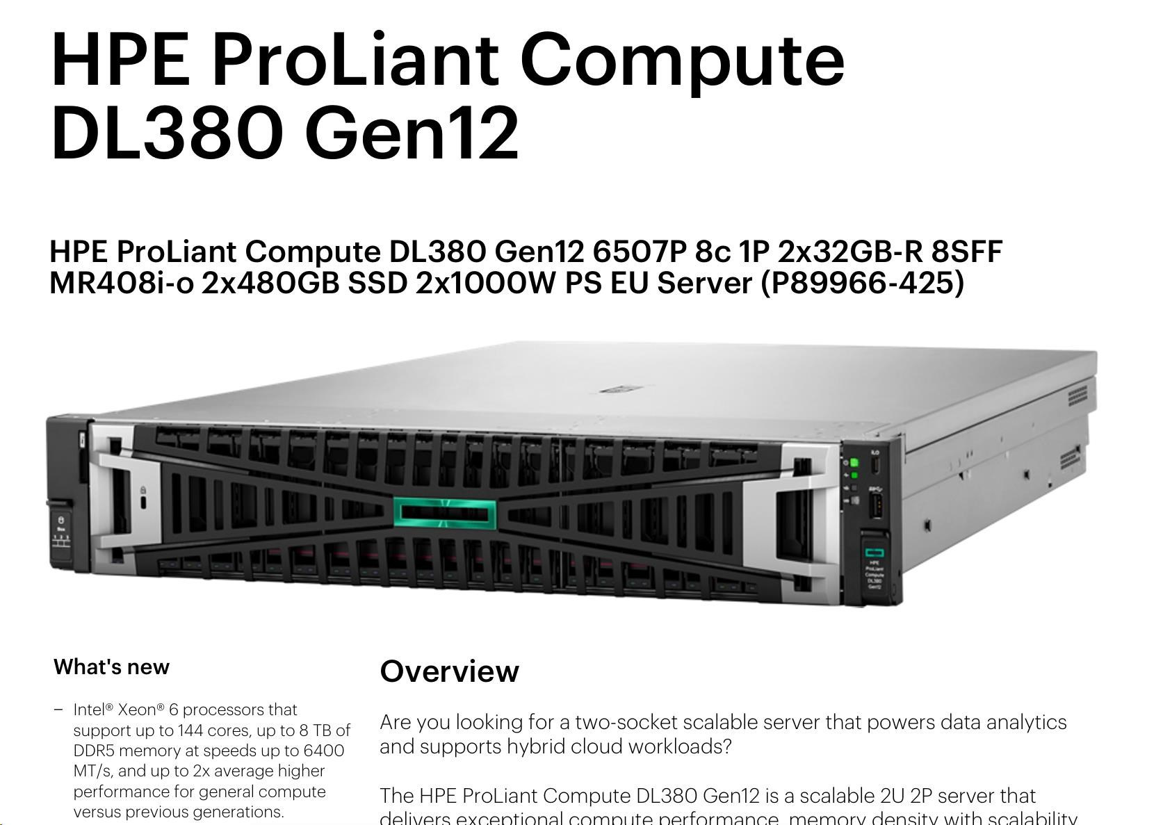 HPE PL DL380 Gen12 6505P (2.2/12C) 2x32G (P69727) 2x480G MR408i-o 8SFF 2x1000W 10GbE NBD333 Smart Choice.