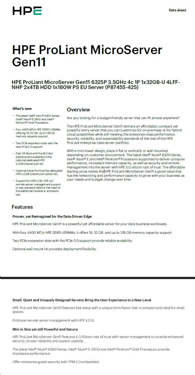 Máte k produktu dotaz? Zeptejte se nás.Hodnocení produktu HPE PL MicroServer Gen11 6325P (3.5/4C) 1x32G 2x4TB SATA 4LFF/SFF-NHP VROC 4p1G iLoPort (P65741) NBD111 Smart Choice