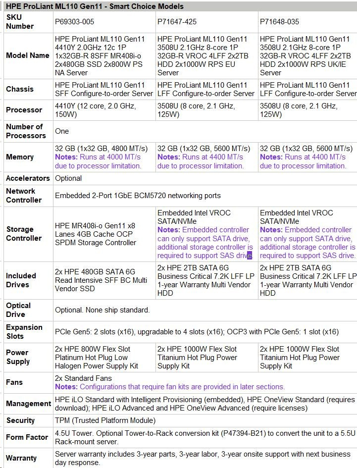 | Chassis | HPE ProLiant ML110 Gen11 LFF Configure-to-order Server |