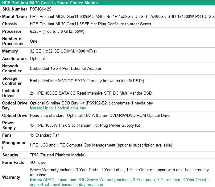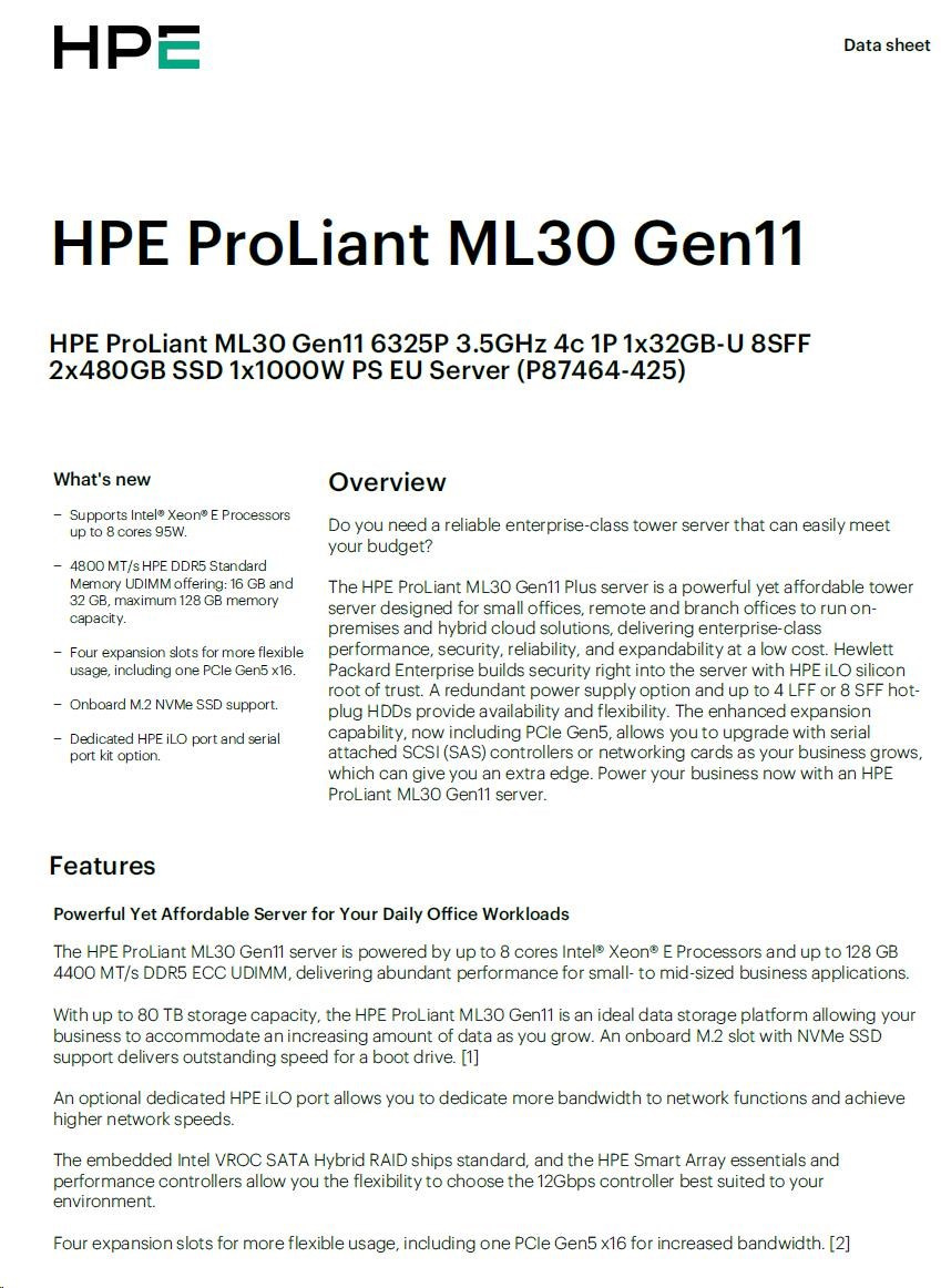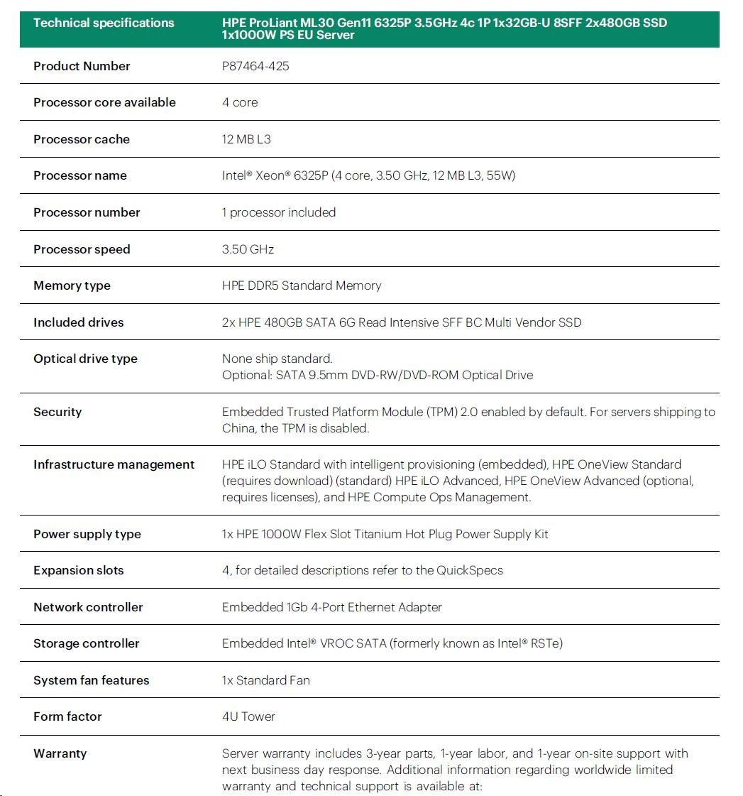 Diskuze k produktu HPE PL ML30g11 6325P (3.5G/4C8T) 1x32G 2x480G SSD 8SFF VROC 1x1000W 4p1G NBD311 Smart Choice