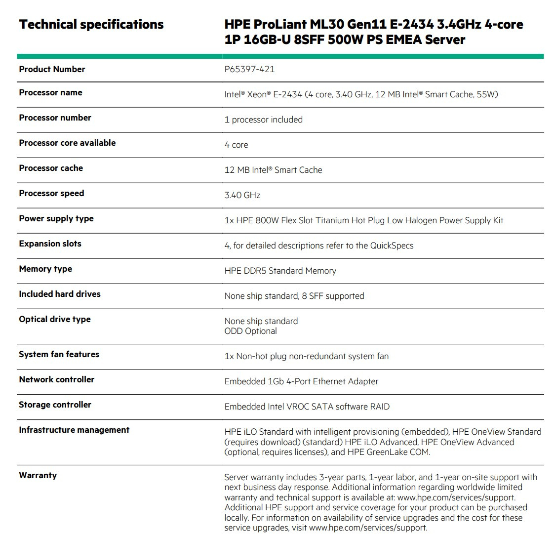 Technical specifications HPE ProLiant ML30 Gen11 E-2434 3.4GHz 4-core 1P 16GB-U 8SFF 500W PS EMEA