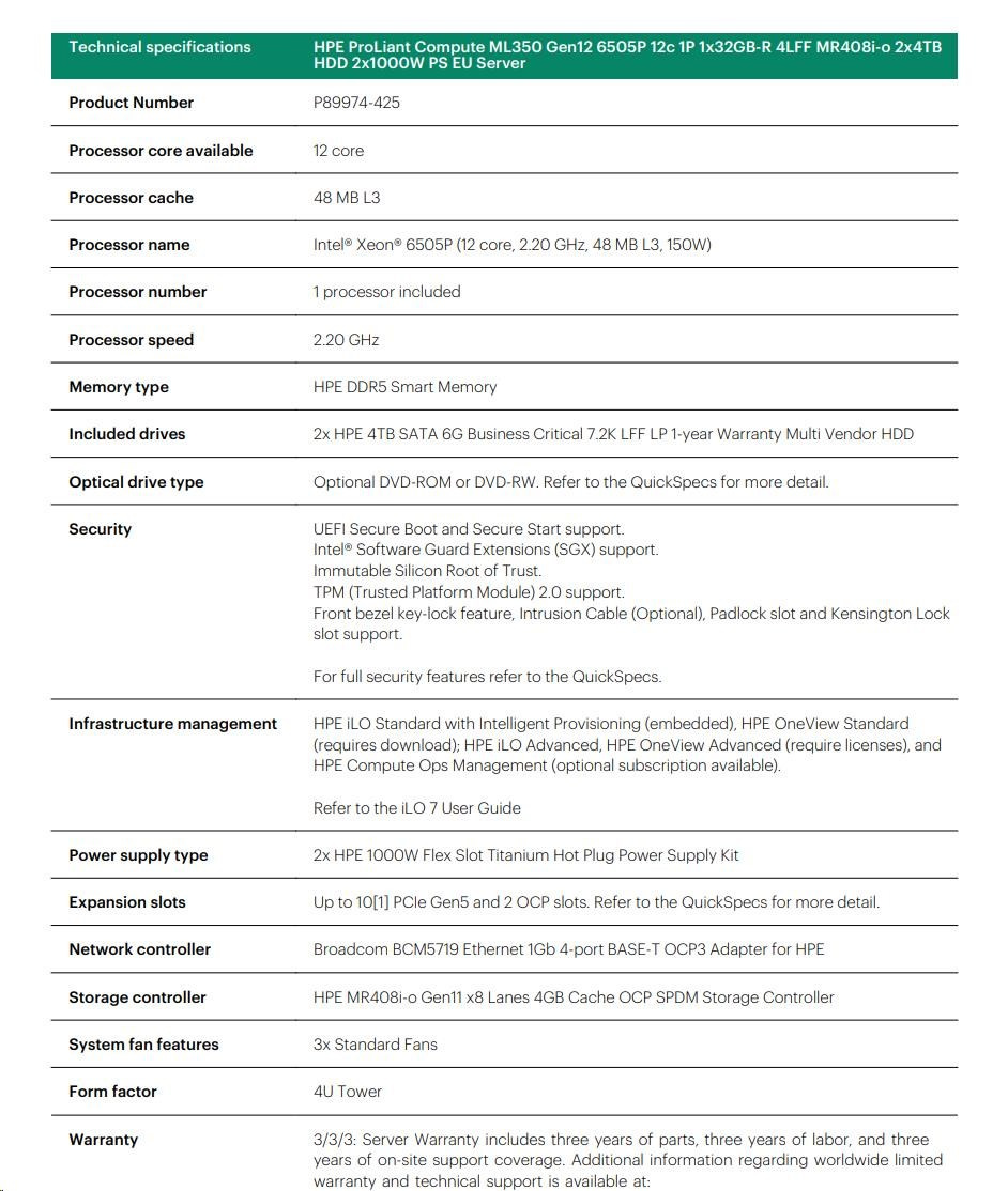 Diskuze k produktu HPE PL ML350g12 6505P (2.2/12C) 1x32G (P69727) 2x4TB 4LFF MR408i-o2x1000W 1GbE NBD333 Smart Choice