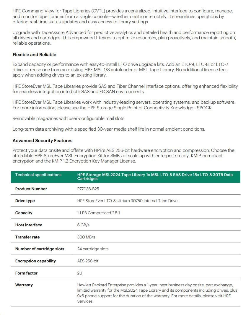 HPE Storage MSL2024 Tape Library (MSL LTO8 SAS Drive + 15x Q2078A LTO8 30TB Data Cartridges + Q2015A BarCodeLabelPack)Typ rozhraní zálohovací mechaniky:externí SAS; Technologie zálohovací mechaniky (kapacita bez/s kompresí v GB):Ultrium 7 (7500/15000); Autoloader/knihovna.