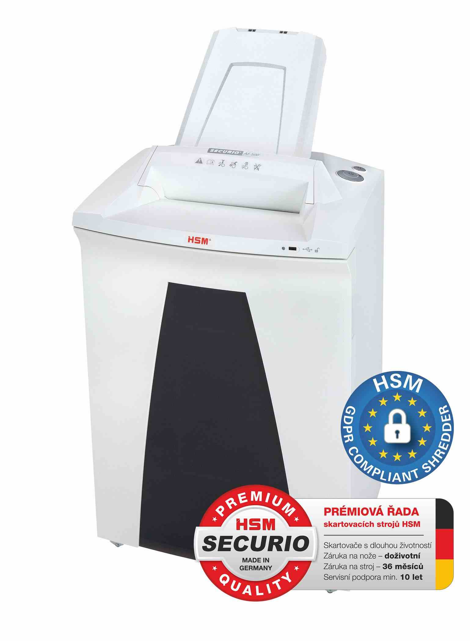 Moderní skartovací stroj s automatickým podavačem dokumentů. Papíry ke skartování lze vkládat přímo do skartovací štěrbiny ovládané fotobuňkou nebo do velkokapacitního zásobníku s kapacitou až 500 listů, jehož obsah po uzavření stroj automaticky zpracuje. Zásobník lze po vložení papíru uzamknout vsunutím USB paměti do zdířky. Do zpracování všech dokumentů je zásobník uzamčen. Odemknout ho lze opětovném vložením té samé USB paměti do zdířky. Po vyprázdnění zásobníku se zámek automaticky uvolní. Zásobník je vybaven čidlem přítomnosti papíru. Nabírání dokumentů zajišťují otočné segmenty s technologií nanogrip, které jsou spolehlivé i při odebírání dokumentů tištěných na nestejných papírech. Konstrukce stroje umožňuje během zpracovávání dokumentů ze zásobníku současně skartovat papíry vkládáné do štěrbiny. Masivní nože v křížovém řezu mají zvýšený stupeň utajení. Umožňují zpracování papíru s kancelářskými sponkami, plastových karet i CD/DVD. Zásobník na odpad o zvýšeném objemu 82 l je vybaven závěsem na plastový pytel. HSM Securio AF500 vyniká tichým chodem, zvýšeným výkonem, spolehlivostí a úsporou elektrické energie v pohotovostním režimu (EMCS). Záruka na stroj 60 měsíců, doživotní záruka na nože. Stroj je vyráběn v Německu, s podporou dodávky náhradních dílů pro případ opravy..