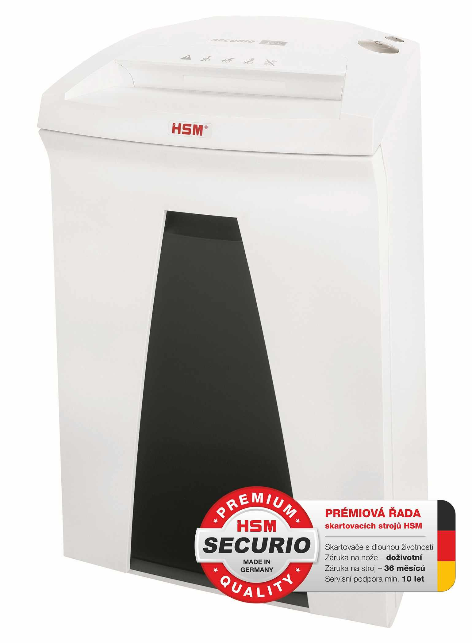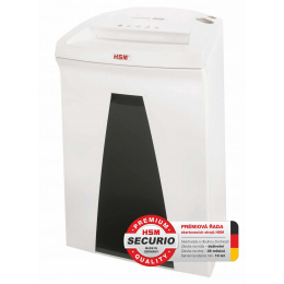 Základní skartovací stroj střední třídy. Obsahuje všechny prvky moderních skartovačů. Multifunkční ovladač s kontrolkami, systém úspory elektrické energie EMCS, masivní nože umožňující skartování papírů i s kancelářskými sponkami, plastových karet a CD/DVD. Pro případ separace nepapírového materiálu je možno pod hlavu nasunout závěs s tkaninovým vakem. Do odpadního zásobníku s průhledem je možné umístit plastový pytel (není povinný). Tento řez je vhodný pro uživatele preferující základní stupeň utajení. HSM Securio B24 vyniká tichým chodem, úsporností, zvýšeným výkonem a spolehlivostí. Záruka na stroj 60 měsíců, doživotní záruka na nože. Stroj je vyráběn v Německu, s podporou dodávky náhradních dílů pro případ opravy..