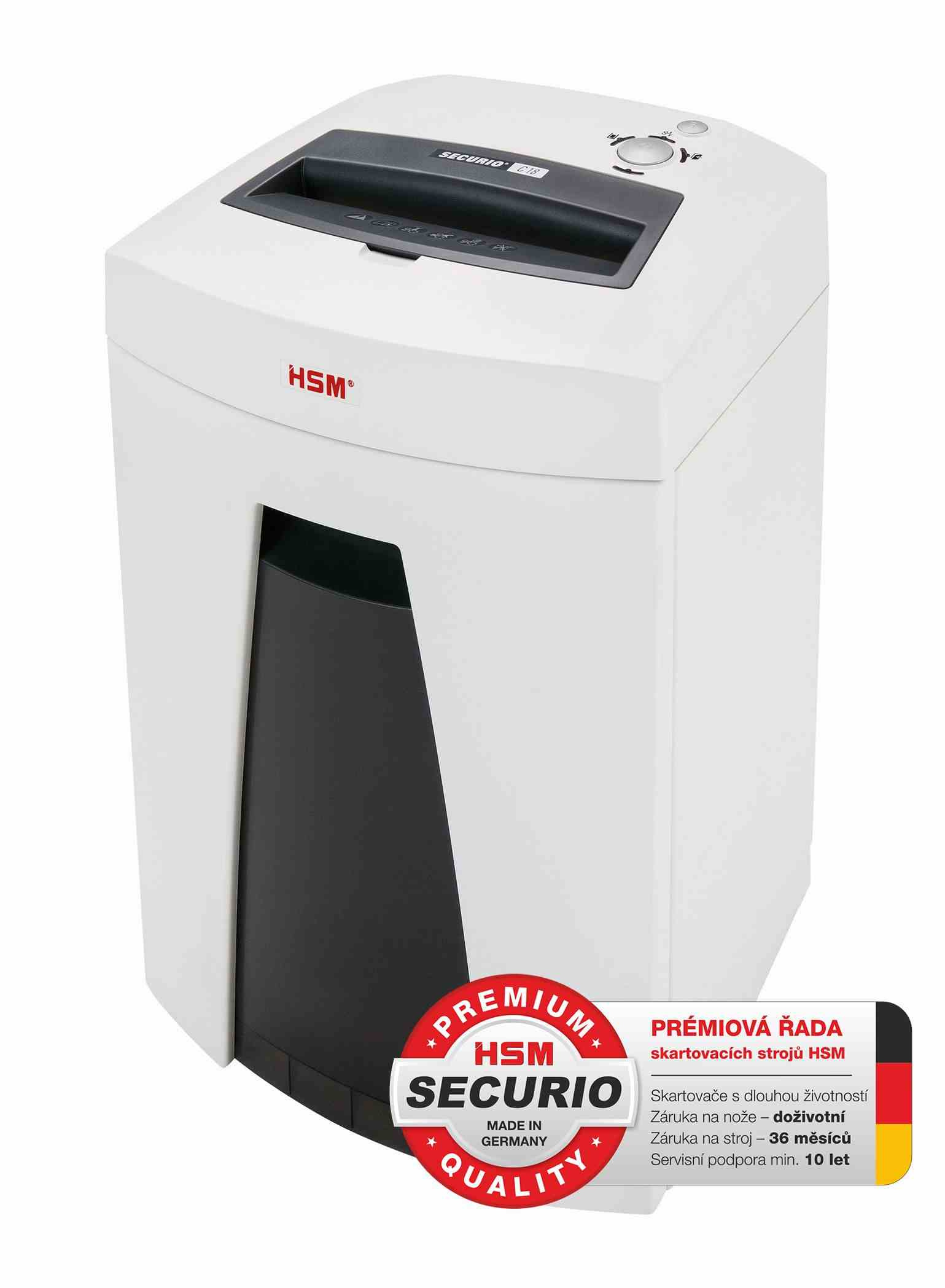 Skartovací stroj řady HSM Securio v kategorii ke stolu se zvýšeným výkonem. Masivní ocelové nože umožňují zpracování papíru i s kancelářskými sponkami, plastové karty a CD/DVD. Tato verze je v základním proužkovém řezu. Doba chodu je omezena tepelnou pojistkou. I tak malý stroj je vybaven vstupní fotobuňkou, bezpečnostním dotykovým vypínačem u vstupního otvoru, indikací poruchových stavů a systémem úspory elektrické energie EMCS. Skartovaný odpad padá do čelně výsuvného zásobníku. Záruka na stroj je 60 měsíců, doživotní záruka na nože. Stroj je vyráběn v Německu, s podporou dodávky náhradních dílů pro případ opravy..