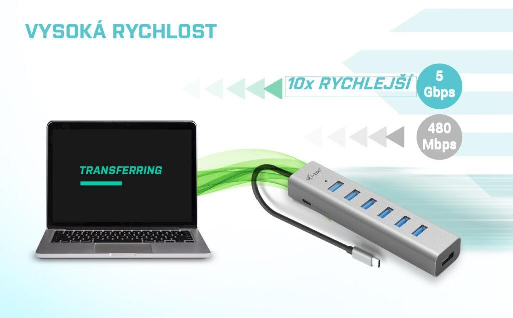 S tímto hubem získáte dalších 7 USB 3.0 portů (až 5 Gbps). Připojte si externí klávesnici a myš, přenášejte data nebo filmy z USB flash disku rychlostí až 5 Gbps nebo nabíjejte svá mobilní zařízení nabíjejte, až rychlostí 7.5W.