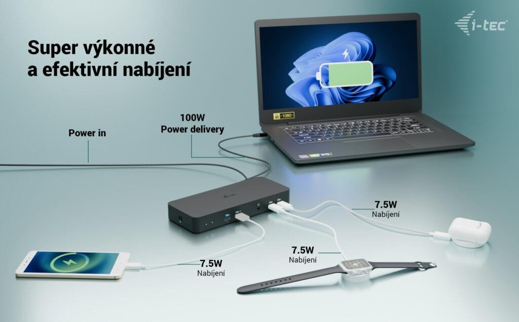 - Dokovací stanice poskytuje až 100 W výkonu pro napájení připojeného notebooku nebo tabletu.