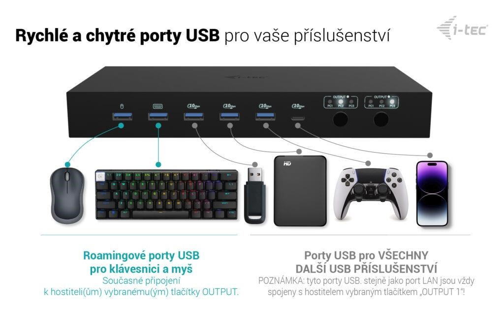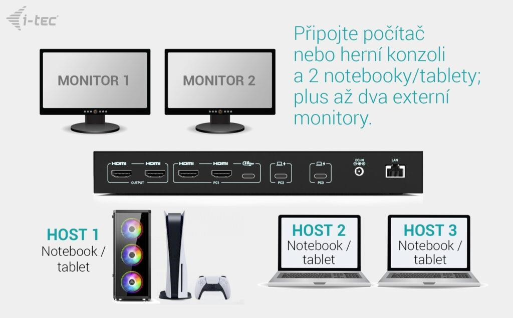 - Podpora až 3 hostitelských zařízení (2× notebook/tablet + 1× herní konzole/PC)