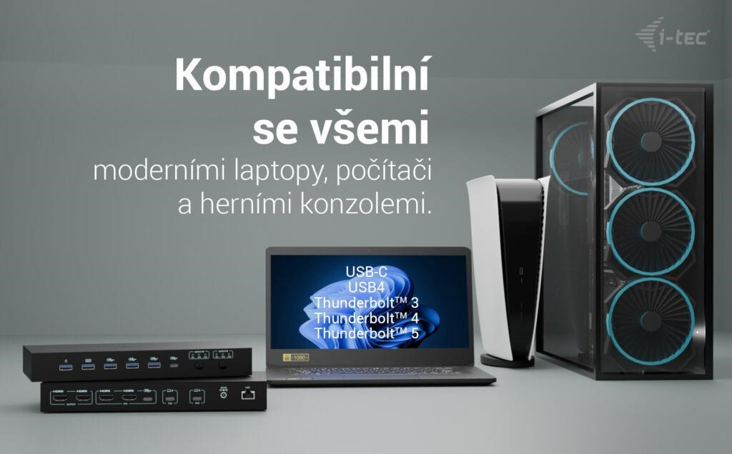 - Je plně kompatibilní se všemi notebooky vybavenými porty USB-C, USB4 nebo Thunderbolt 3/4/5. PC nebo herní konzoli lze připojit přes 1–2× HDMI a USB.