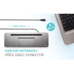 - Ergonomický design s hliníkovým krytem, dokovací stanice je vybavena integrovaným 60cm kabelem USB-C, takže je vhodná pro použití se všemi notebooky a tablety s displeji do 15" včetně.