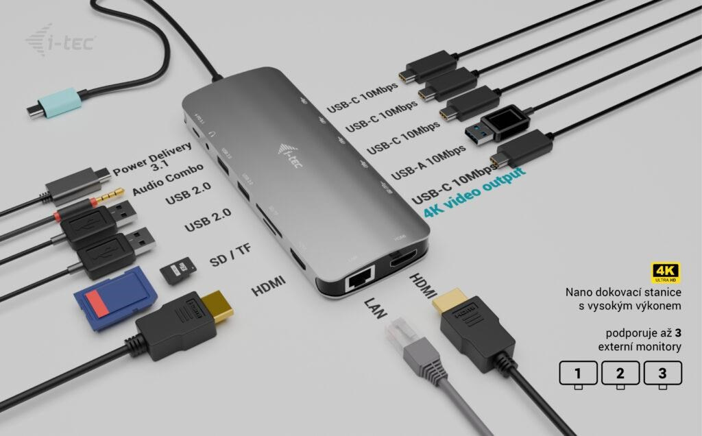 - Malá, ale výkonná kovová dokovací stanice USB-C, ke které lze připojit až tři externí monitory