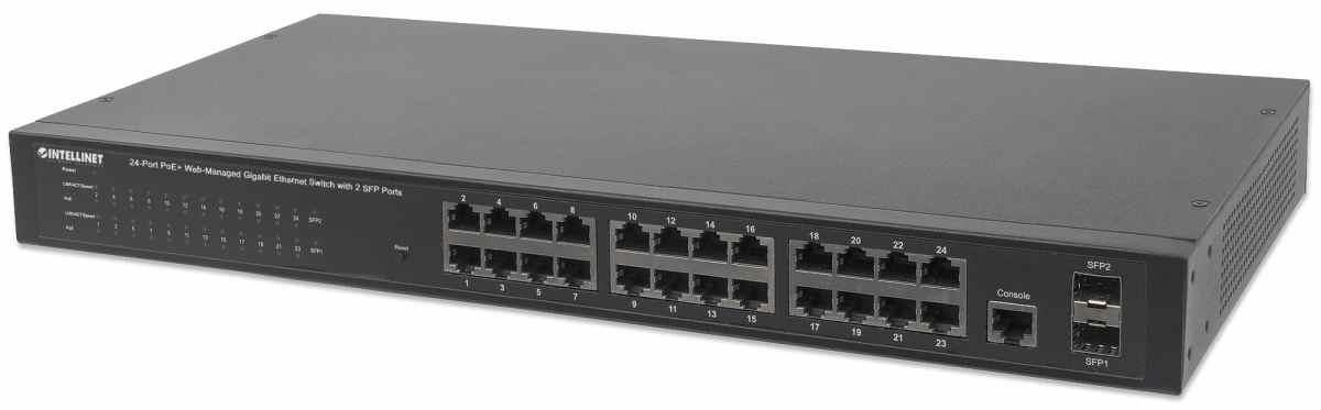 Intellinet 24-Port PoE Web-Managed Gigabit Switch with 2 SFP Ports (180 W), 24 PoE+/PoE ports 802.3at/af