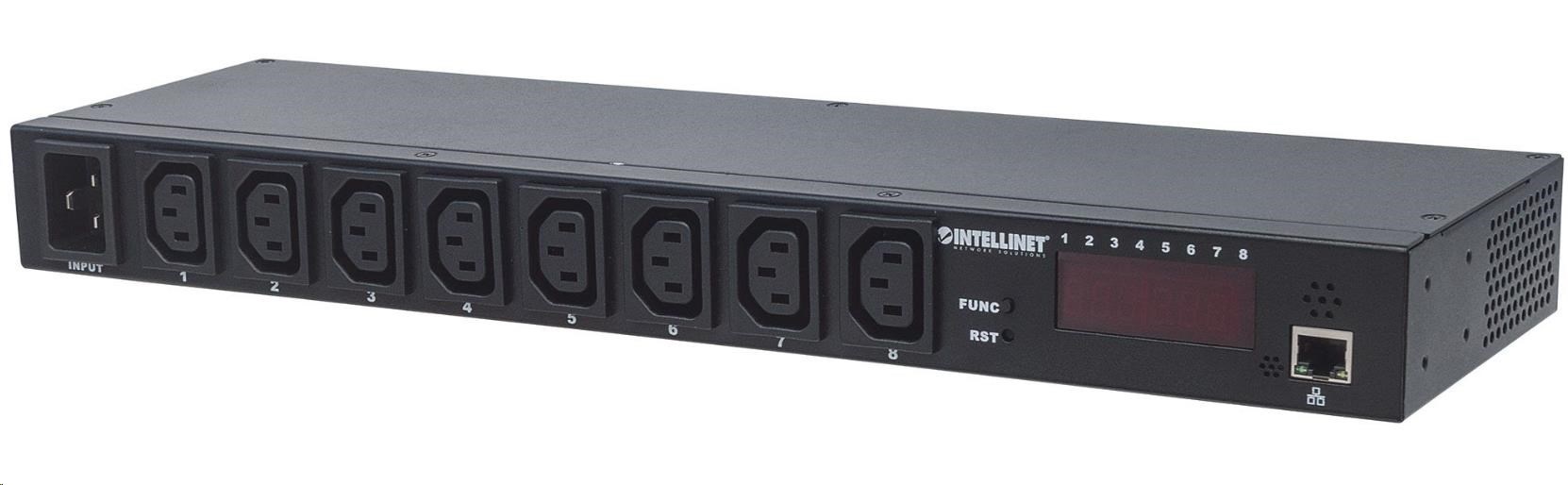 Model Number 163682 19" Intelligent 8-Port PDU 19" Rackmountable Intelligent Power Distribution Unit; Monitors Power, Temperature and Humidity •Eight-port, IEC320 C13 power output with total current of 16 A •Displays total delivered power in voltage and watts •Built-in temperature and humidity sensor monitors the operating environment •Power input: one IEC320 C20 •Power outputs: eight IEC320 C13 •LAN connection: one RJ45 port Technical •Voltage input: 110-240 V 50/60 Hz •Voltage output: 110-240 V 50/60 Hz •Voltage measurement range: 90-264 VAC increment of 1 V •Current measurement range: 0-20 A increment of 0.1 A •Temperature measurement range: 0° – 50°C (32° – 122°F) increment of 1°C (1°F) •Humidity measurement range: 20% – 90% increment of 1%.