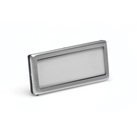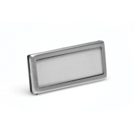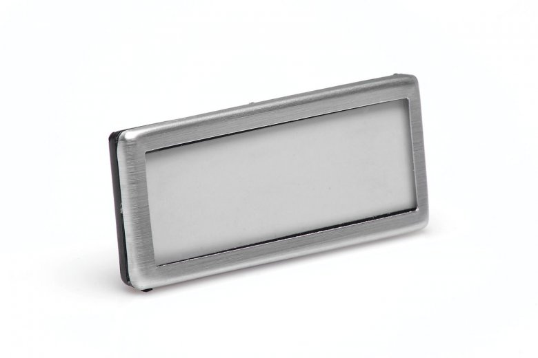 Jmenovka s okénkem o rozměru 65×26 mm. Vnitřní rozměr 62×18 mm. Kombinace hliník / černý plast. Část jmenovky určená k popisu je chráněna čirým tuhým plastem. Možnost uchycení na oděv pomocí špendlíku nebo kovových úchytek..