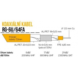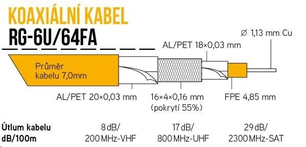 Diskuze k produktu Koaxiální kabel RG-6U/64FA 7 mm, trojité stínění, impedance 75 Ohm, PE venkovní, černý, cívka 305m