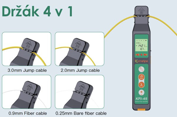KOMSHINE KFI-45 Identifikátor optických vláken + VFL + OPMProstřednictvím identifikátoru vlákna lze bez rušení přenosu zjistit směr signálu a relativní výkon