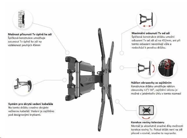 Kvalitní otočný sklopný držák Tv Fiber Mounts SP500Kvalitní nástěnný držák špičkové konstrukce na Tv 32-60", otáčení do stran +/- 60°, naklápění +2° / -15°, vzdálenost od zdi 49-482mm, korekce roviny +/- 3°, kryty na kabeláž, krásný design, VESA 75x75 až 400x400, nosnost 40kg.