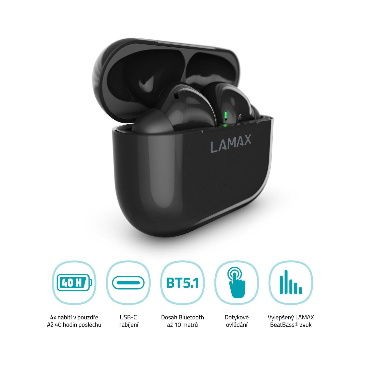 LAMAX Clips1 ti udělají radost vyladěným LAMAX BeatBass® zvukem, kdykoliv si je nasadíš. Nahoď fresh playlist a zaposlouchej se do masivních beatů! S nejnovějším Bluetooth 5.1 a AAC kodekem ti potečou songy z mobilu do sluchátek v nejvyšší kvalitě. Přepínej je rychlostí blesku díky dotykovému ovládání. Špunty se připojí, hned jak je vyndáš z pouzdra.