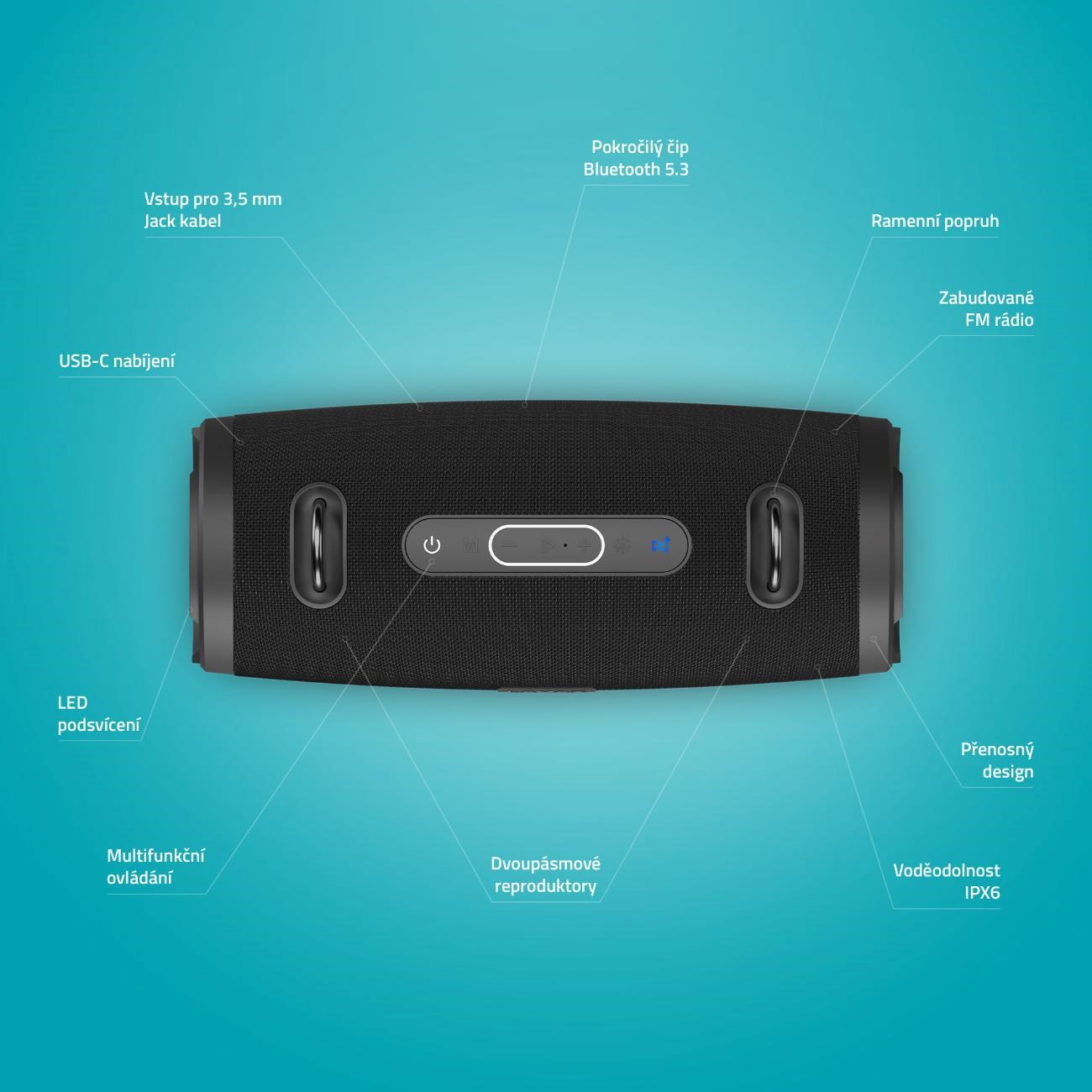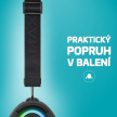 Minimalistický, ale moderní a vychytaný design repráku s LED podsvícením upoutá na první pohled a je škoda schovávat ho doma. Přidali jsme proto ergonomický popruh pro snadný přenášení, ať si svýho parťáka můžeš brát kamkoliv s sebou. Když zmoknete, nic se neděje, voděodolnost IPX6 má vodu pod kontrolou. A pokud by tě trápilo, že budeš muset studovat návod, tak klídek, tady je ovládání tak snadný a intuitivní, že ho zvládne i děcko.
