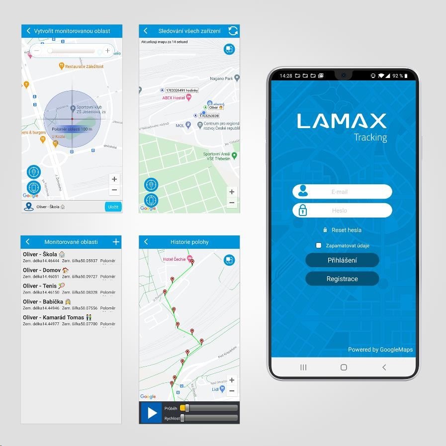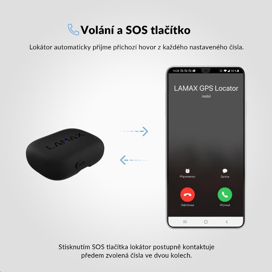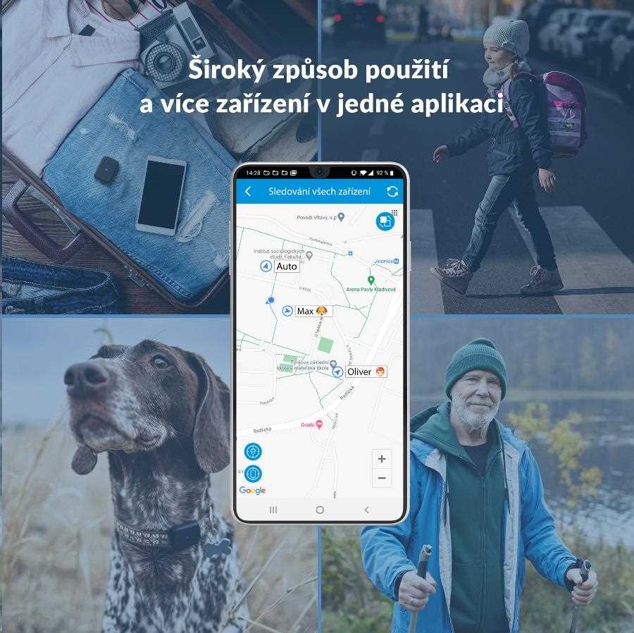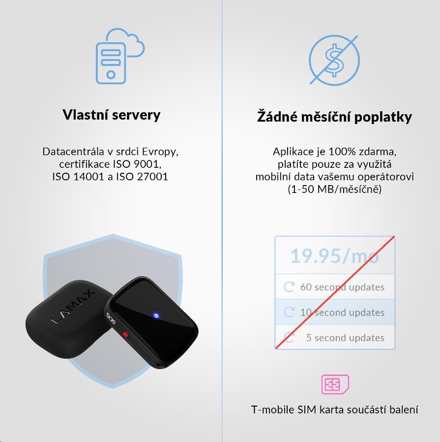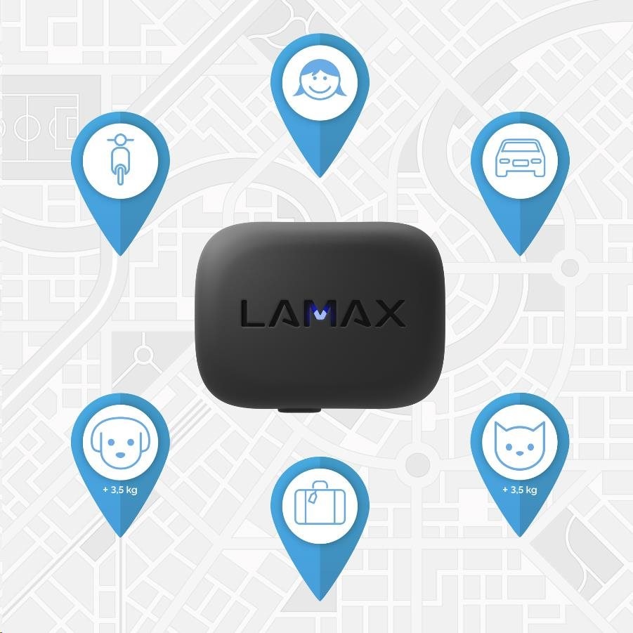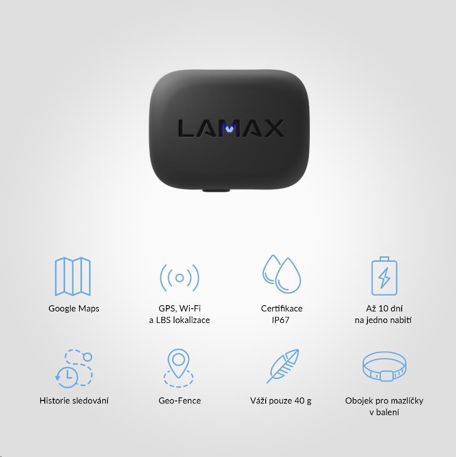 GPS Locator s výdrží baterie až 10 dní, ideální pro hlídání domácích zvířat, potomků, seniorů i movitých věcí, vodotěsnost IP67, hlasové funkce, SOS tlačítko, miniaturní rozměry, váha 40 gramů, aplikace LAMAX Tracking se spoustou chytrých funkcí, záznam trasy.