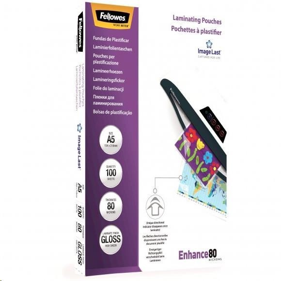 Laminovací fólie Fellowes A5 80 mic ImageLast, balení 100 ksProdukt:Laminovací fólie; Formát:A5; Vlastnosti:Lesklá.
