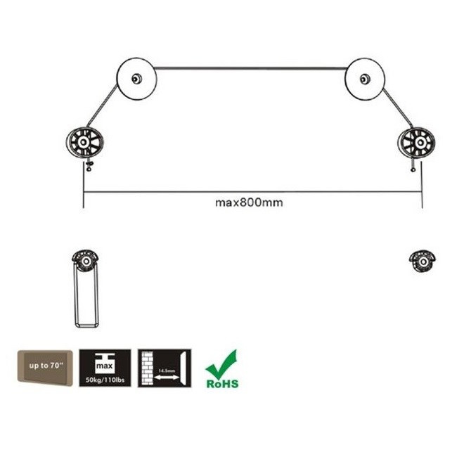 Lankový držák na Tv Fiber Mounts M5C57Závěsný lankový držák na Tv 37-70", vzdálenost Tv od zdi 14mm, snadná instalace, lankový systém, VESA 200x200 až 800x400, nosnost 50kg.