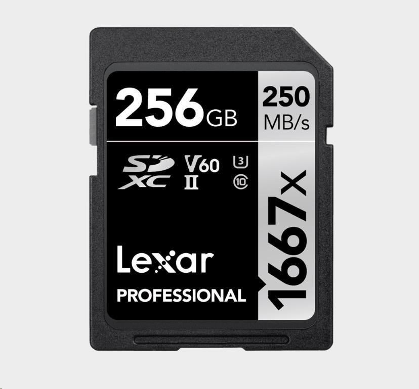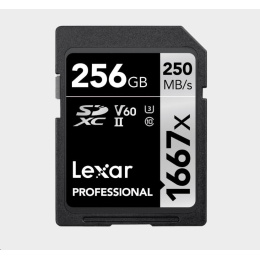 Lexar SDXC Pro 1667X UHS-II U3 R250/W120 (V60) 256GTyp karty:SDXC; Kapacita uložiště:256 GB; Rychlost zápisu min. (MB/s):120; Rychlostní kategorie:Class 10; UHS:U3; Video Class:V60; Typické použití:Nahrávání 4K videí.