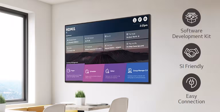 UM5N-H je vybaven vysoce výkonným SoC, který umožňuje provádět více úkolů bez samostatného přehrávače médií. Platforma webOS poskytuje nástroje pro vývoj aplikací s intuitivním uživatelským rozhraním, které zvyšuje pohodlí uživatelů a umožňuje snadné připojení k externím senzorům a partnerským aplikacím webOS a vytváří tak prostředí přátelské k SI.