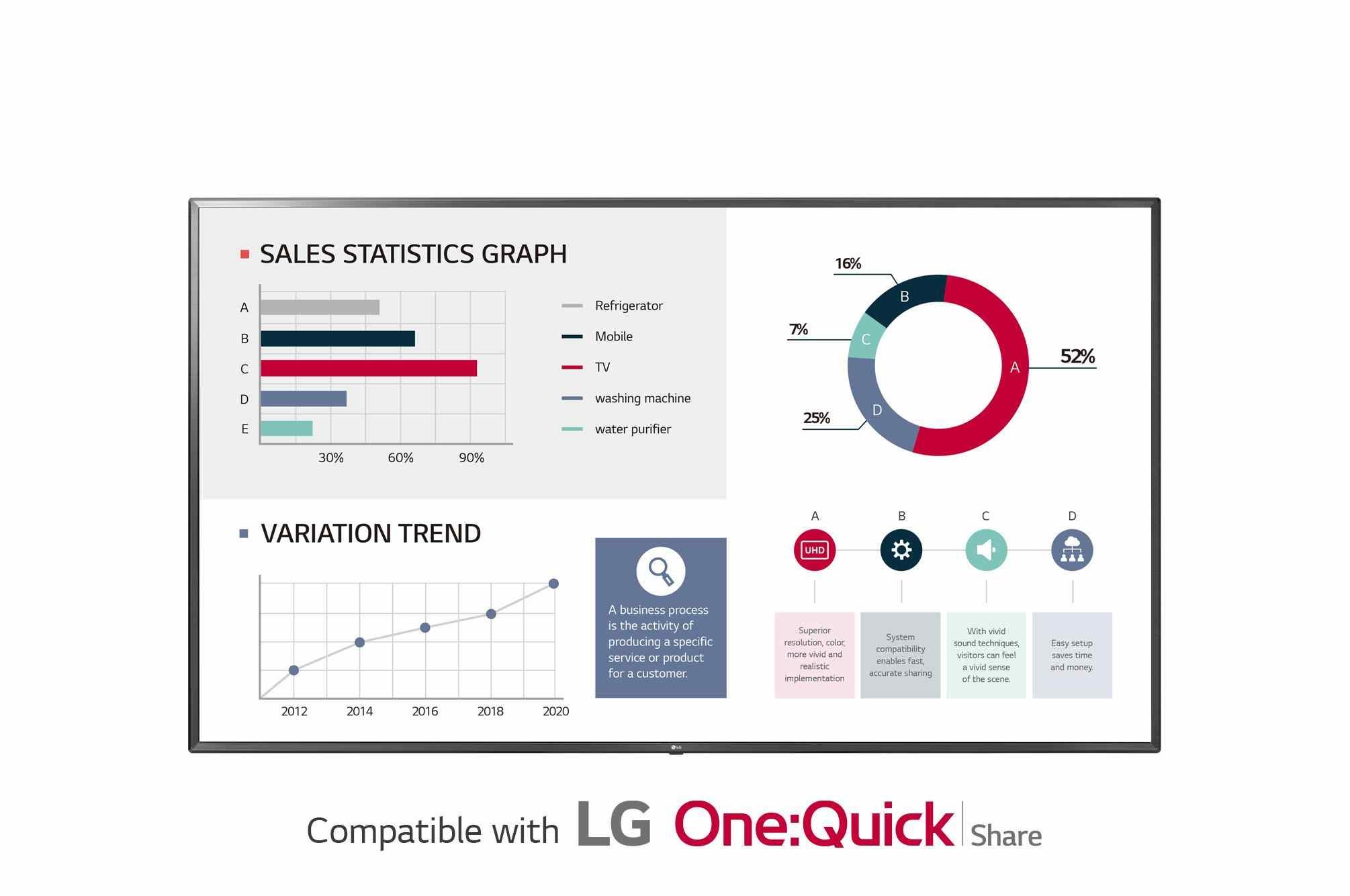 Vestavěný čtyřjádrový procesor SoC může provádět několik úkolů najednou a současně zajistit plynulé přehrávání obsahu bez potřeby přehrávače médií. Platforma LG webOS smart signage také zvyšuje pohodlí uživatelů pomocí intuitivního grafického uživatelského rozhraní a jednoduchých nástrojů pro vývoj aplikací.