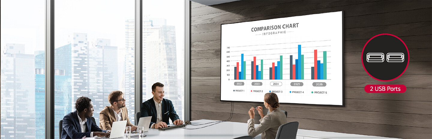 Díky podpoře dvou USB portů nabízí digitální signage displej 75UH5N-M všestranné možnosti použití. Je například možné ovládat obsah na obrazovce a zároveň používat další připojená zařízení. To zahrnuje praktické úkoly, jako je stahování souborů PPT z externích úložných zařízení při používání myši nebo klávesnice během schůzky.