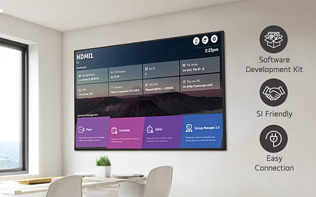 75UH5N-M je vybaven vysoce výkonným SoC, který umožňuje provádět více úkolů bez samostatného přehrávače médií. Platforma webOS poskytuje nástroje pro vývoj aplikací s intuitivním uživatelským rozhraním, které zvyšuje pohodlí uživatelů a umožňuje snadné připojení k externím senzorům a partnerským aplikacím webOS a vytváří tak prostředí přátelské k SI.