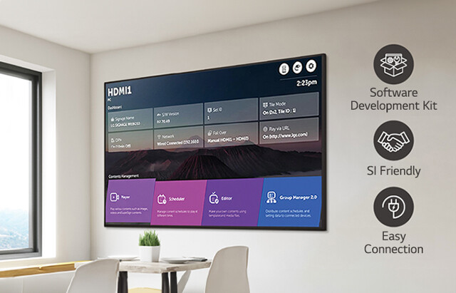 Model 86UH5N-M je vybaven vysoce výkonným SoC, který umožňuje provádět více úkolů bez samostatného přehrávače médií. Platforma webOS poskytuje nástroje pro vývoj aplikací s intuitivním uživatelským rozhraním, které zvyšuje pohodlí uživatelů a umožňuje snadné připojení k externím senzorům a partnerským aplikacím webOS a vytváří tak prostředí přátelské k SI.