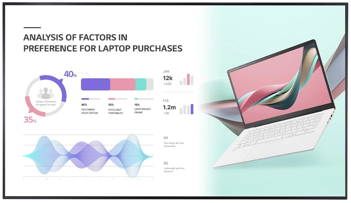 Řada UH5J-H s doporučeným jasem 500 cd/m2 pro vnitřní zobrazení zřetelně zobrazuje obsah a přitahuje pozornost veřejnosti, takže je nejvhodnějším displejem pro marketing v zasedacích místnostech, na letištích, v obchodech, nákupních centrech atd.