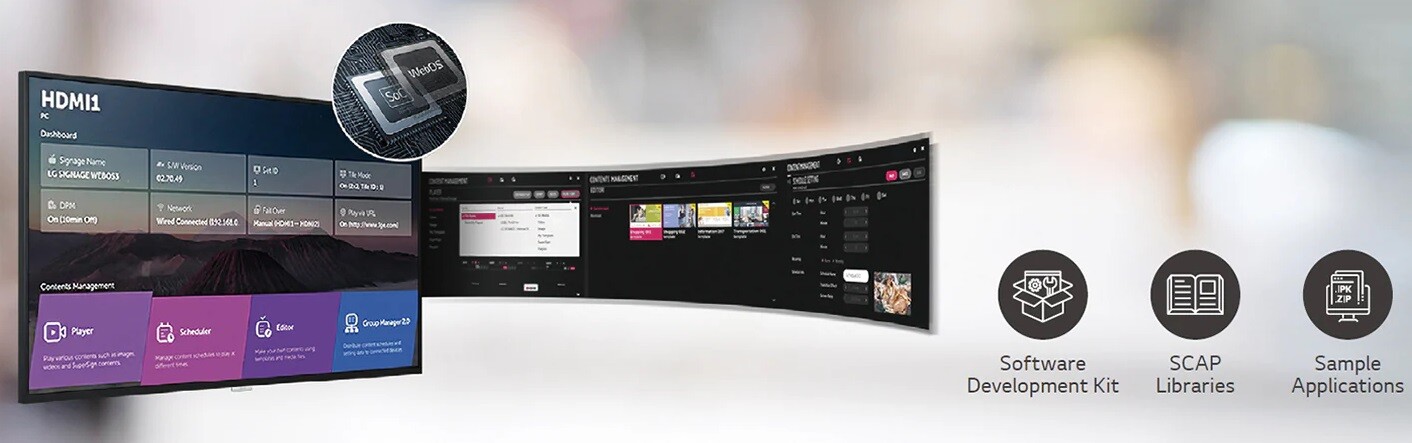 - Internal Memory 16GB, Built-in Wi-Fi, Temperature Sensor, Auto Brightness Sensor, Acceleration (Gyro) Sensor, Local Key Operation, webOS6.0, Embedded CMS (Local Contents Scheduling, Group Manager), USB Plug & Play, Fail over, Background Image (Booting Logo Image, No Signal Image), Sync Mode (RS-232C Sync, Local Network Sync), Multi-screen (PIP, PBP (4)), Screen Share, Video Tag (4), Play via URL, Rotation (Screen Rotation, External Input Rotation), Gapless Playback, Tile Mode Setting (Max. 15 × 15), Setting Data Cloning, SNMP, ISM Method, Auto Set ID, Status Mailing, Control Manager, 3rd Party Compatibility (Crestron Connected), Power (Smart Energy Saving, PM mode, Wake on LAN, Beacon, HDMI-CEC, SI Server Setting, webRTC, Pro:Idiom)