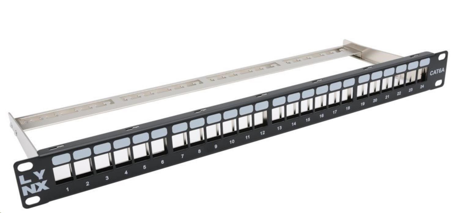 Diskuze k produktu LYNX Patch panel, 19'', 24 portů, 1U, Cat5e/6/6A/7, neosazený, stíněný, vyvazovák, černý