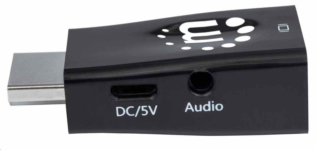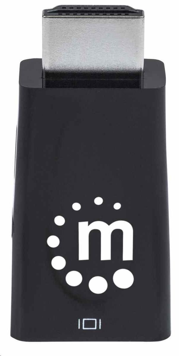 The Manhattan HDMI to VGA Micro Converter establishes a fast, simple and convenient link between a newer HDMI-equipped desktop, notebook computer or other media source and an existing VGA monitor, projector or other display device. The Manhattan HDMI to VGA Micro Converter is easy and quick to install and requires no complicated configuration or setup. This converter helps extend the service life of legacy VGA display equipment so you can get the most out of your investment and fully realize its value. The Manhattan HDMI to VGA Micro Converter offers a low-power, cost-effective and reliable solution so users can transition to HDMI bandwidths, resolutions, Deep Color and more without the expense of upgrading to newer and costly monitors and projectors. Its integrated, all-in-one design helps achieve a compact, integrated solution that eliminates unnecessary cables, tangles and clutter to keep installations and workspaces neat and orderly. Its 3.5 mm stereo port allows the converter to transmit audio to an external audio device, and its Micro-USB port allows for additional power if required.
