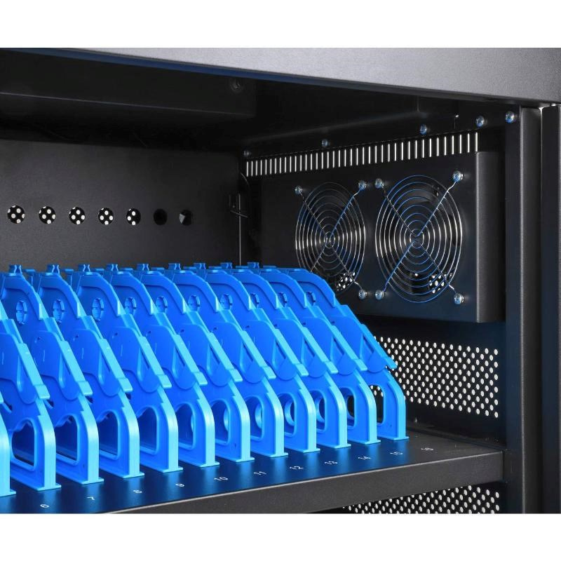 Vestavěné AC zásuvky v PDU na zadní straně jednotky usnadňují nabíjení zařízení, jako jsou notebooky, notebooky, tablety, telefony a mnoho dalších pomocí jejich napájecích adaptérů nebo nástěnných nabíječek. Správci mají pohodlný přístup přes dvířka na zadní straně jednotky, aby se mohli zapojit do zásuvek a přivést kabely k zařízením v přední části.